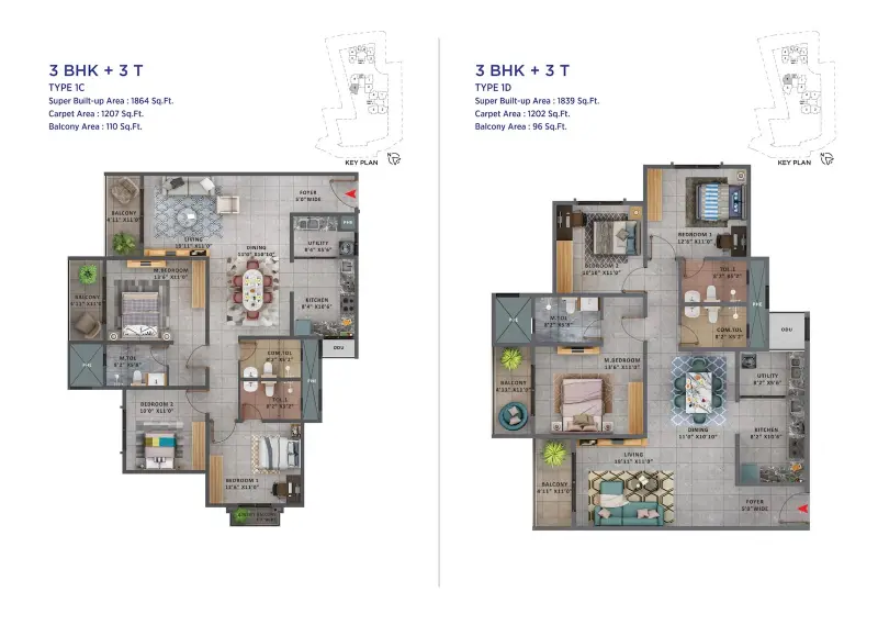 Spacious 3BHK units range from 1616 to 1864 Sqft, perfect for families needing extra room.