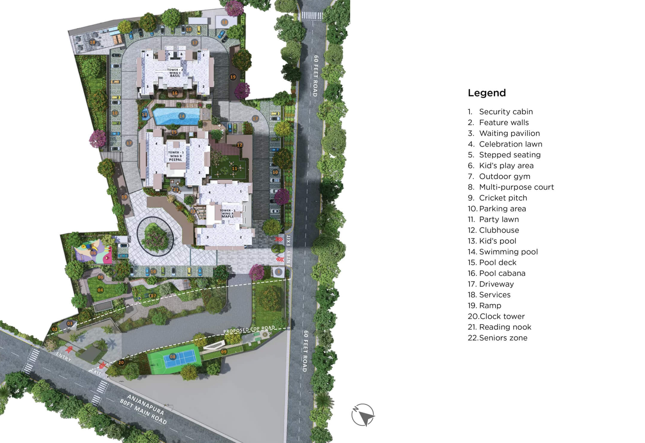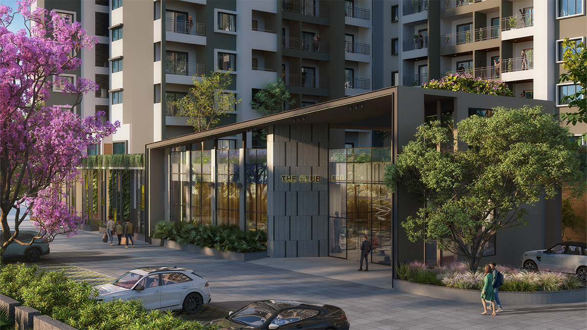 Residents have access to a 30,000 sq ft clubhouse, swimming pool, gym, sports courts, indoor games, landscaped zones, and wellness spaces.